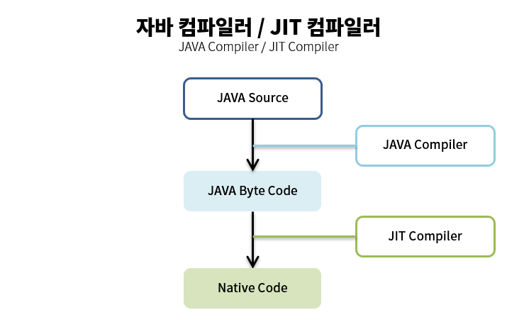 - interpreter 방식으로 명령어를 실행하다가 적절한 시점에 JIT compiler가 자바 바이트 코드 전체를 Native Code로 컴파일 한다. 이후부터는 Interpreter가 아닌 Native Code를 통해 명령어를 실행하게 된다. Interpreter를 통해 한 줄씩 명령어를 실행하는 것보다 Native Code를 실행하는 것이 더 빠르다. Native Code는 캐시에 보관되기 때문이다.